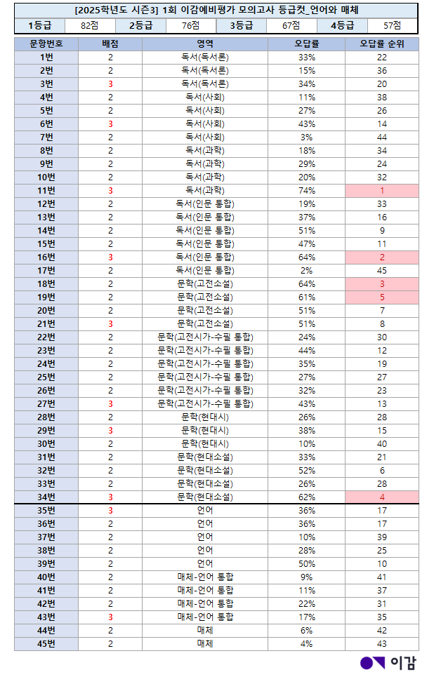 2025학년도 시즌3 제1차 예비평가 등급컷 및 오답률입니다.